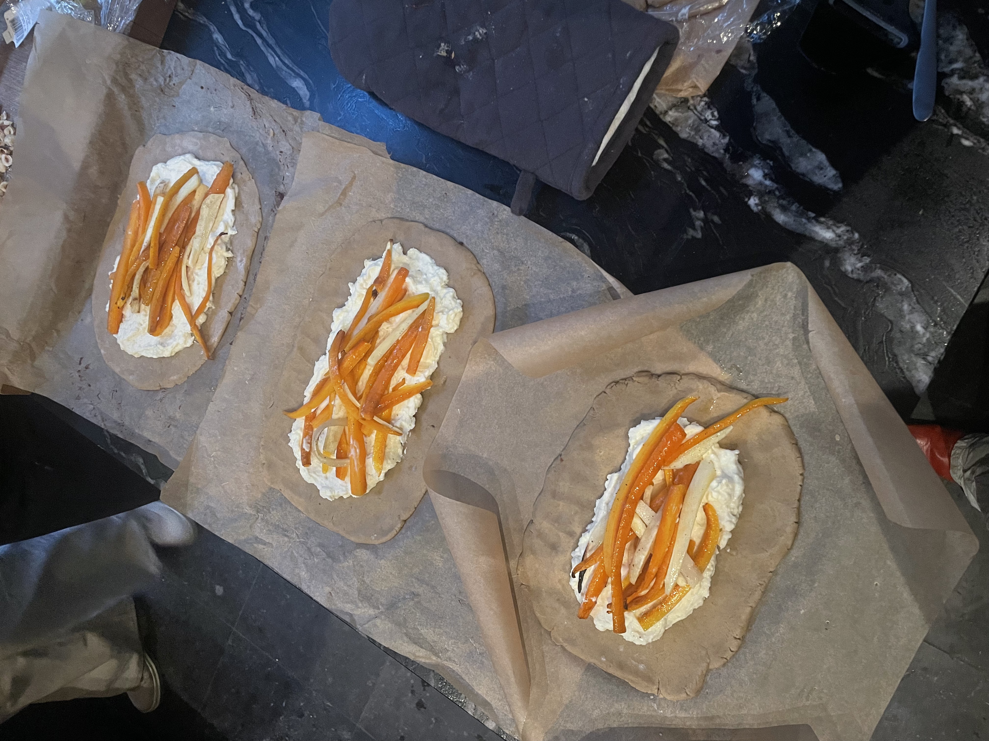 Experimental (birthday) dinner party. Starting with desert: A hell of a horseride’ crunchy date, cashew coco mousse and labneh cream. Carrot gallete with farmers cheeses.